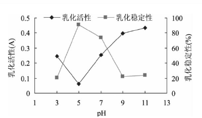 [9]等人研究鷹嘴豆分離蛋白乳化性時,采用不同pH值梯度對其進行測定。pH值范圍選定為3、5、7、9、11,分別測量在不同pH處理過后的蛋白的乳化活性和乳化穩(wěn)定性。結果如下: