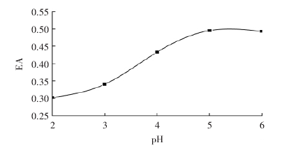 [5]等人在研究大豆乳化性質(zhì)的課題中,采用不同梯度的pH值對大豆蛋白粉進行處理,加熱溫度為60℃下,采用1mol/L的鹽酸調(diào)節(jié)大豆蛋白溶液的pH,范圍為2.0-6.0,處理30min,測定其乳化性。結果如圖: