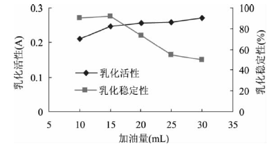 圖2 加油量對鷹嘴豆分離蛋白乳化活性及乳化穩(wěn)定性的影響