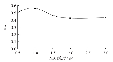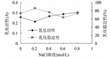 [9]等人在研究鷹嘴豆分離蛋白乳化性質(zhì)時,選用不同梯度的離子濃度,分別為0.1、0.2、0.4、0.6、0.8mol/L的NaCl溶液,測定乳化活性和乳化穩(wěn)定性。結果如下: