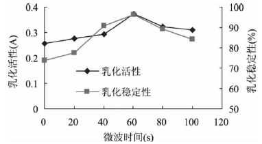 [9]等人對鷹嘴豆分離蛋白應用不同處理方式,并研究了這些處理方式對蛋白乳化性質(zhì)的影響。課題中取100ml濃度為0.5%(w/v)的蛋白質(zhì)溶液,用 0.5mol/L的NaOH調(diào)節(jié)pH為7.0,然后置于微波爐中處理,微波爐功率為800w,處理時間分別為0、20、40、6080、100s,處理完后加入20mL大豆色拉油,高速攪拌后根據(jù)2.2.1中所述方法測定EA和ES。