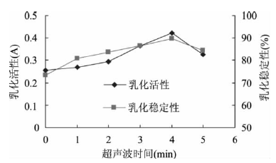 從圖中明確看出,處理時間為4min時,乳化活性和乳化穩(wěn)定性達到**大值。這是因為在超聲波作用下,蛋白質(zhì)分子的結構變得疏松,使疏水性多肽部分展開朝向脂質(zhì),極性部分朝向水相,故乳化活力增加。但繼續(xù)延長超聲波處理時間,蛋白質(zhì)變性程度增大,不溶性蛋白質(zhì)含量增多,乳化活力及乳化穩(wěn)定性隨之又降低。