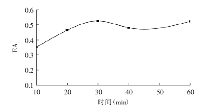 [5]等人采用不同梯度的加熱時間對大豆蛋白進行處理,在60℃,pH=5的條件下,處理10~60min大豆蛋白溶液,測定其乳化性。結果如圖: