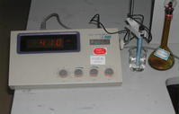 實驗室常用的酸度計有老式的G產(chǎn)雷磁25型酸度計(**小分度0.1單位)和pHS-2型酸度計(**小分度0.02單位),這類酸度計的pH值是以電表指針顯示。新式數(shù)字式ph計有G產(chǎn)的科立龍公司的KL系列,其設定溫度和pH值都在屏幕上以數(shù)字的形式顯示。無論哪種ph計在使用前均需用標準緩沖液進行二重點校對。 shou先閱讀儀器使用說明書,接通電源,安裝電極。在小燒杯中加入pH值為7.0的標準緩沖液,將電極浸入,輕輕搖動燒杯,使電極所接觸的溶液均勻。按不同的ph計所附的說明書讀取溶液的pH值,校對pH計,使其讀數(shù)與標準緩沖液(pH7.0)的實際值相同并穩(wěn)定;然后再將電極從溶液中取出并用蒸餾水充分淋洗,將小燒杯中換入pH4.01或0.01的標準緩沖液,把電極浸入,重復上述步驟使其讀數(shù)穩(wěn)定。這樣就完成了二重點校正;校正完畢,用蒸餾水沖洗電極和燒杯。校正后切勿再旋轉(zhuǎn)定位調(diào)節(jié)器,否則必須重新校正。