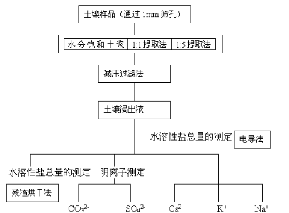 ① 水溶性鹽的浸提; ② 測定浸出液中鹽分的濃度。制備鹽漬土水浸出液的水土比例有多種,例如1:1、2:1、5:1、10:1和飽和土漿浸出液等。P 179