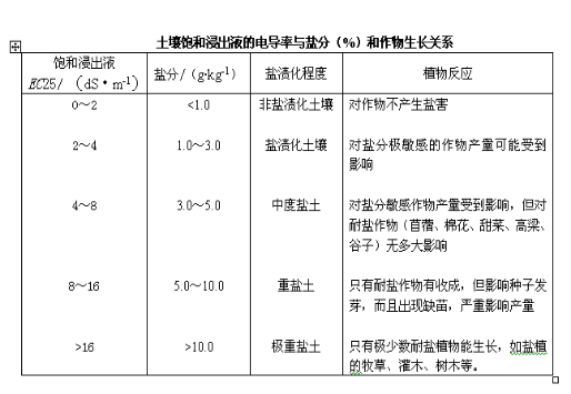 可以作為確定鹽漬土類型和鹽漬化程度的依據(jù),對于改良鹽漬土具有重要意義。在使用此數(shù)據(jù)確定各項指標(biāo)時,地區(qū)性很強,應(yīng)結(jié)合土壤類型、質(zhì)地、土層結(jié)構(gòu)、排水性、氣候、作物等情況綜合考慮。#p#分頁標(biāo)題#e#