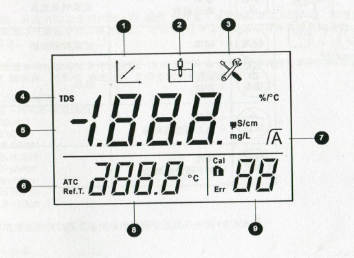 ④TDS因子設(shè)置或參數(shù)設(shè)置            ⑤電導(dǎo)率/TDS讀數(shù)或電極常數(shù)       ⑥自動溫度補償